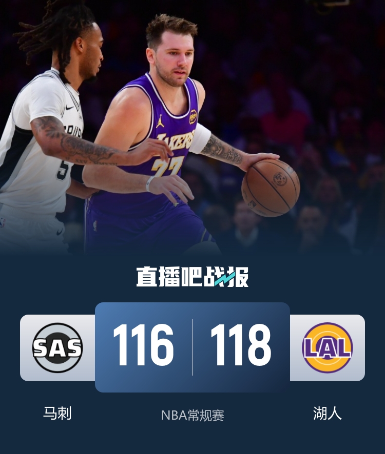 比赛开始,马刺反客为主率先发力,轮番强攻内线连投带罚拿分,很快取得两位数领先,东契奇得分助攻一肩挑率队追赶,次节八村塁开始发力,内外开花带队反超,马刺继续冲击篮筐稳住局势,东契奇攻防两端延续输出,半场战罢湖人60-59领先马刺1分。易边再战,双方继续缠斗,比分咬得很紧,文班亚马一条龙暴扣,东契奇继续全面发挥,卡斯尔成为奇兵,内外开花单节独得9分帮助马刺一度获得两位数优势,末节湖人展开反击,多点开花不断蚕食分差,东契奇关键三分率队反超,文班亚马犯满离场,斯玛特关键时刻发球失误送出球权,尚帕尼造成犯规后关键绝平两罚不中。最终,湖人118-116马刺险胜过关。